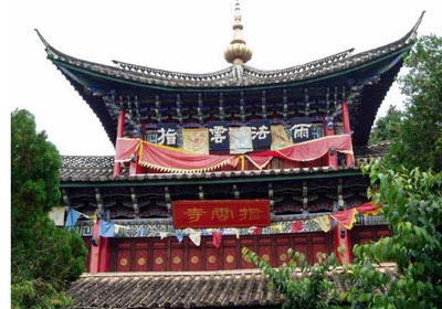 该寺原有13院,现存1个大院及5个小院。大院为二进院落,有门楼、过厅、厢房、大殿,整个建筑外形精巧,内部庭院有植于两三百年前的岩桑、槐、银杏、脑脂梅和云南樱花等五株古树名术,环境幽静古朴。大殿为三重檐楼阁,寺顶覆瓦,雕梁刻柱,明显不同于藏区碉房式建筑,体现出汉、藏、白、纳西建筑艺术交融的特色。左右两侧檐柱粗重踏实,并作双柱础处理,即在覆盆式柱础上置木雕莲花柱础,以便于更换糟朽檐柱,可谓独具匠心。该寺近年大修,焕然一新。寺旁所产蜜桃,个大色艳,清香甘甜,享有盛誉。寺前湖光山色,农舍田畴,错落有致,景致极佳。