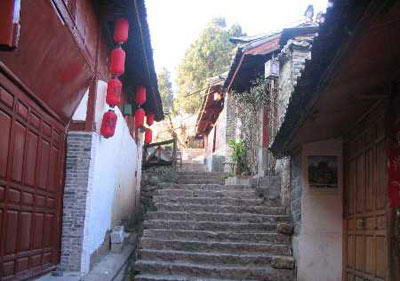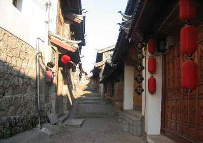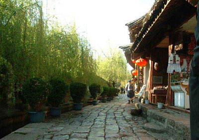 今天的新华街,被称为“古道第一境”。从历史上看,它的确是古时进入四方街的主要街道。古城依山傍水的格局在这条街上体现得特别明显。进入其境,先要爬坡,然后随山势渐趋平缓,直到四方街。由北往南,右边的房屋倚山而建,屋后树木森森;左侧则是就水(西河)而筑,一楼就在河道边上,开门即可在河中取水,二楼高度与新华街地面相平,也门便是街市。所以,从新华街上看,左边多数只有一层楼,绕到西河一看,又是两屋楼房,现在也有了三层的建筑,但都是传统样式,与周围环境融为一体,没有鹤立鸡群的难受。这当然与政府的引导和宏观管理是分不开的。