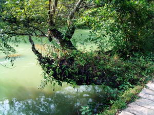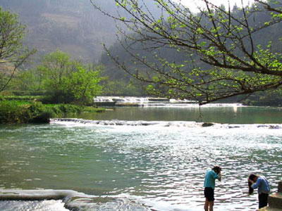 板台之上,河道宽直,视野开阔。风情浓郁的布依村寨位于河边;村旁古木参天,修竹茂密,芭蕉成行,河边清泉四溢,幽兰生长;沿河缓缓而行,幽兰生谷香生径,方竹满山绿满溪。河中远山倒影扑朔迷离,近处原始古朴的水车缓慢运转,两岸稻浪翻滚,金黄一片。面对这幽静迷人的田园风光,定会依依不舍,留恋忘返。
