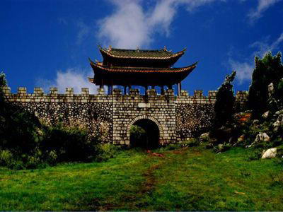 胜境关位于富源县城东南7.5千米滇黔交界的山脊上,又称界关。老黑山南北纵贯100余千米,山势陡险,惟胜境关山势较低,而且有一条驿道通向贵州,所以这里是古代由黔入滇的重要关隘。关口立有1座界坊,坊匾上书“滇南胜境”4个大字,故名胜境关。界坊高约12米,宽12米,楹柱涂金绘彩,重檐翘角,雄伟壮观,界坊始建于明景泰年间,后多次修葺,现仍存。
