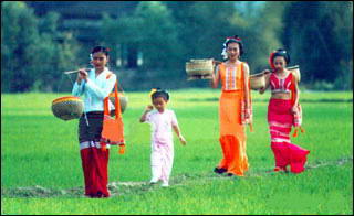 走入傣家,仿佛是到了另一个时空,游人不禁陡生隔世之感。傣家竹楼造型美观,简朴而又不失雅致,且有冬暖夏凉和防潮防震的特点。宽敞的庭院洁净、舒适。院落子里种满了各种热带四时果树,爱美的傣家人还广种奇花异草,各种花草奇斗妍,竟放芬芳,一年四季花果飘香。到傣家竹楼上作客,傣家人一整套待客礼仪令人产生由衷的感动和许多感想。傣家菜肴,绿色食品比重较大、禽蛋、山珍、野菜等丰富而又味道鲜美、纯正。这可能也是傣家少女身材苗条、面容清秀俊美的缘故之一吧。
