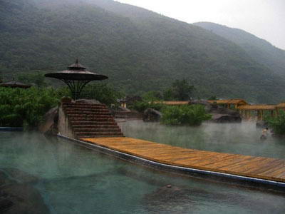 园区建设规划设计时充分遵循因地制宜,保护自然生态,露天沐浴池设计建在乱石丛中,与天然奇峰异石融为一体,既保护了自然景观,又得到风格独特的环境效果,给人回归自然,融入自然的感受,配合云南民族风情建筑和民族文化表演,给人以耳目一新的享受。