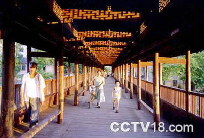熟溪桥造型优美、结构独特,富有浓郁的民族风格:它全长135.7米,由9孔呈斧舟形的石墩组成。这匠心独运的造型,上顶桥梁,下落泥沙,排列成行,坚固扎实,大大减轻了水流对桥身的冲力。其一,墩上架枕木垛,层层挑出,用硬木作梁,跨径达12米;其二,桥面建有屋亭49间,以屋护桥,桥屋一体,两侧有护雨板保护,减少了风雨日光对桥梁的侵蚀;其三,桥面上两侧桥往连着供人休息的长凳,把桥面分隔成三道,中间通车马,左右走行人;其四桥的中段楼阁高耸,浮雕精美,气势磅礴,朴实雅致,显示出明代建筑艺术的特点。在桥身两侧还建有独具江南特色的木质栏杆,富有园林建筑的风味。人们到此凭栏远眺,憩息小坐,便会感受到一种古朴雅致的意境和情趣。这座飞檐重迭的长廊大桥,不仅便利了交通,更是一件难能可贵的历史珍品。它可与闻名于世的广西三江侗族自治县的程阳桥媲美,是桥梁建筑史中的一座胜迹。