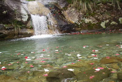 下去就是六浪漈,又叫鹿狼漈、六郎漈。“漈”就是悬崖。这里的漈,其实就是瀑。六浪漈,分六级,每级都好几丈高。水从上面冲下来,打在阶级上,飞起浪花,又冲向下一级……如此连续冲下飞起六次,才到漈底。漈底的岩石仰头观望,飞扬的水花好看极了。只因为这里山高,水流量不很大,才叫“漈”,若是水源足一些,冲下来的水多一些,就更壮观了。也就应该叫做“六浪瀑”了。