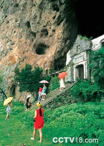 田野尽头,穿过山坡上那片松林有数百竿劲竹,路边有些条石,三五岩块的地方是“着衣亭”旧址,因明清时大忠祠春秋二祭,官宦到此都须振衣弹冠以示恭敬,再步上几十级台阶,穿过仙月洞门,便到一个一百多平方米,高数十米的长方形平台,站在平台上,远处雾霭、岛礁、波涛,就是文公所赞“万象画图里,千崖玉界中”的海天风光。横在洞口的石墙中间那副门联:“丹室辟洞天仙踪犹在,忠祠崇福地正气长存”,概括了仙岩洞的历史,这儿晋时就成为道家修炼的洞府,那时称为“法云院”,宋时改称“百花清洞”。“第一洞天”四字门额是清光绪时留下的。