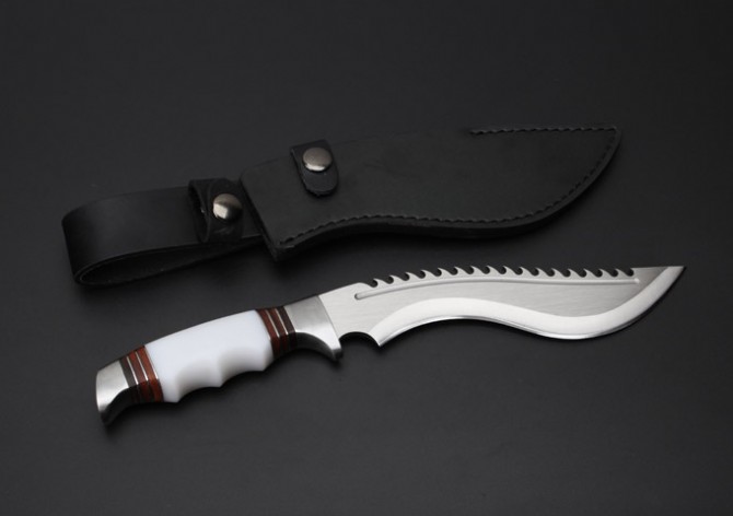 于保护握刀的手。即使相当粗的圆木它也能砍断,这对于盖棚子或扎筏都有很大的好处。弯月型砍刀的刀刃可分为三部分:A部分适于劈柴砍骨头之类的重活;B部分刀刃利薄,适于给动物剥皮;C部分刀刃也很锋利,用于材料的局部加工。B和C部分刀口不易损坏,A部分尽管锋利,但由于常干重活,所以还是容易卷曲或形成缺口。刀鞘必须带有能固定砍刀、使之安全的绊扣,还应有一扣环以便穿在腰带上。有些刀鞘在正面还有一个能装小块磨刀石的口袋。切记,砍刀刀刃划破刀鞘露出来的危险是存在的。拔刀时千万不要用手去握刀刃所对刀鞘的那一边,这样会有危险。养成总是握刀背所对那一边的习惯。刀刃轮廓类型的选择,若过于锐尖,会很快用损;而过于精细,则容易产生缺口。