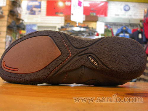 KEEN更为简单的休闲鞋,鞋底更薄主要通过鞋垫来增大弹性保持舒适,非常轻便,鞋底几乎为麻面,非常平整,纹路简单。