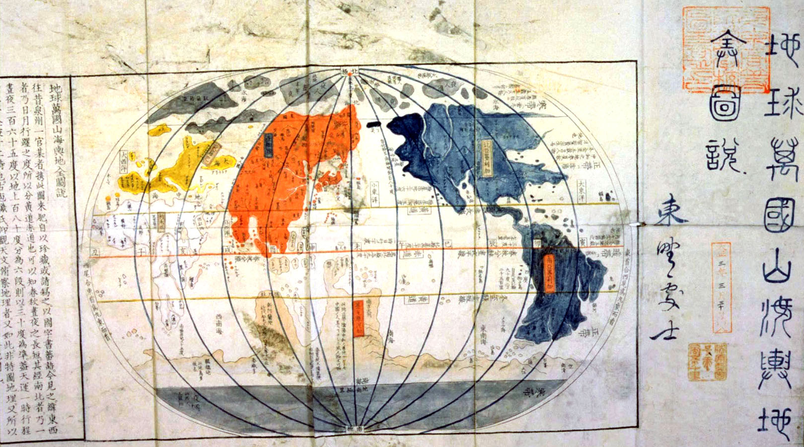 世界图(外标题)新制舆地全图(内标题)地球万国山海舆地全图说1844年(天保15)35×92(内26×79)木版彩色1长玄珠(长久保赤水),临谷田谦校阅,与箕作省吾作品同名。
