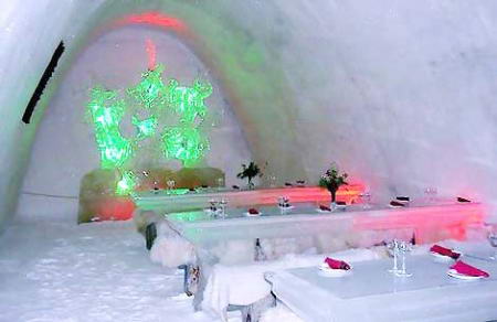 这里的一切都是冰雪砌成。冰墙、冰桌、冰椅、冰床、冰雕、冰酒吧、冰酒杯、冰厕所、冰花瓶,冰教堂,甚至连在冰酒杯里盛满的也是加了冰块的瑞典名酒———伏特加。