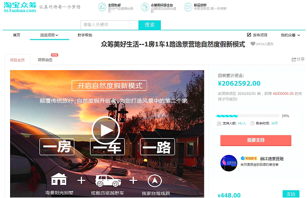 近日,丽江拉市海逸景营地“1房1车1路”创新度假产品在淘宝众筹结束了3天的预热,正式进入为期40天的众筹阶段。在淘宝众筹中,表现十分抢眼。在12月22日,开筹5分钟,众筹金额就达到10万余元,对于一种新型自然度假模式来说,在这么短的时间内就有这样的表现,开局不错,也值得深思。到12月22日截稿前,上线仅1天的时间,众筹金额已经强势突破200万。