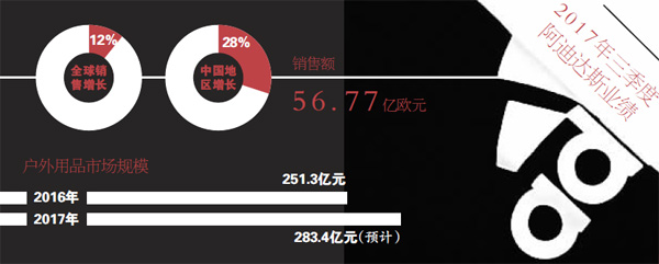 经过改名、推出新品、营销等一系列措施,阿迪达斯探锐正在逐步加强品牌建设。公司业绩报告显示,户外品牌为阿迪达斯的整体业绩贡献了重要力量。11月9日,阿迪达斯发布的2017年三季度财报显示,阿迪达斯全球销售增长12%,相比2016年的17%略降5个百分点,但中国地区业绩继续保持平稳,增长28%,成为全球增速最快的市场。2017年三季度,剔除汇率因素,阿迪达斯全球收入增长12%,其中阿迪达斯品牌增长13%。根据阿迪达斯方面介绍,增长主因源于公司旗下的跑步、户外、运动经典系列及neo系列热销,这两个系列产品的销量均取得两位数增长。