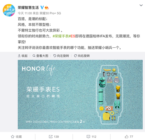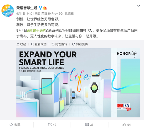 据荣耀官方消息,在此次IFA展上荣耀将会有多款新品亮相,荣耀智慧生活官方微博表示,“9月4日#荣耀手表#全新系列即将登陆德国柏林IFA ,更多全场景智能生活产品同步发布”。
