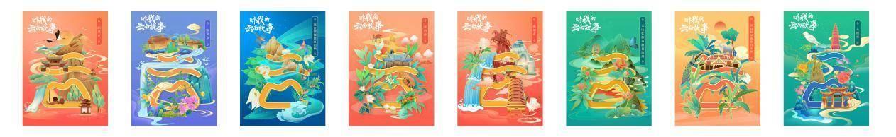同时在分享发布中,特别挖掘十六州市的特色旅游资源,以工笔画国风画法,与游云南logo“云”字融合,形成不同地方特色的海报视觉,全面推广云南十六州市的风貌特色,达到双重推广效果。