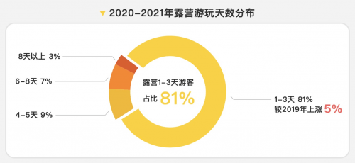 放松休闲的属性决定了以周末出行为主的“微度假”是露营最主要的场景。数据显示,81%的游客选择用1-3天来体验露营,亲近自然、恢复元气。露营地的选择也不仅局限于所在城市,很多消费者喜欢到周边城市体验更新鲜的环境。比如,广州和深圳的消费者,会选择自驾1-2小时即达的惠州、佛山、中山露营。