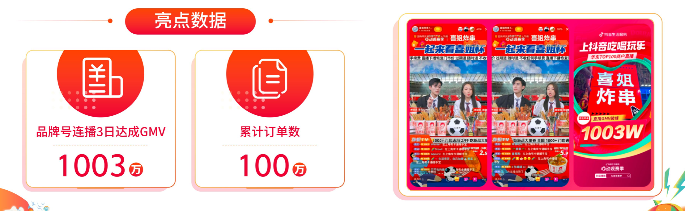 在抖音生活服务心动观赛季期间,喜姐炸串推出王牌单品,满足球迷边吃边看的场景需求。打造“一起来看喜姐杯”主题直播间,通过有趣的谐音梗拉动直播间氛围,实现了品牌号连播3日GMV1003万的销售成绩。
