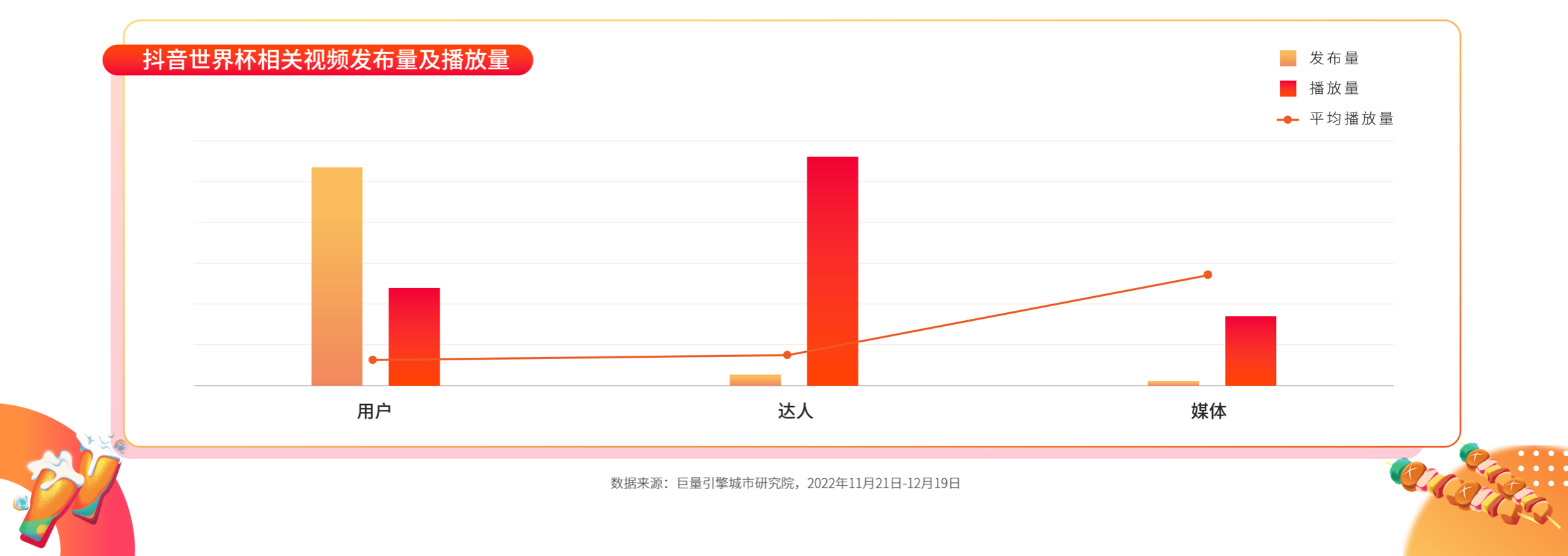 这场盛宴中,用户、达人、媒体积极参与,尽情狂欢。用户参与度高,发布视频数量最多;达人视频吸引力高,获得的播放量最大;媒体发布的视频,平均单条世界杯视频带来86万播放,是抖音世界杯内容生态的重要一环。