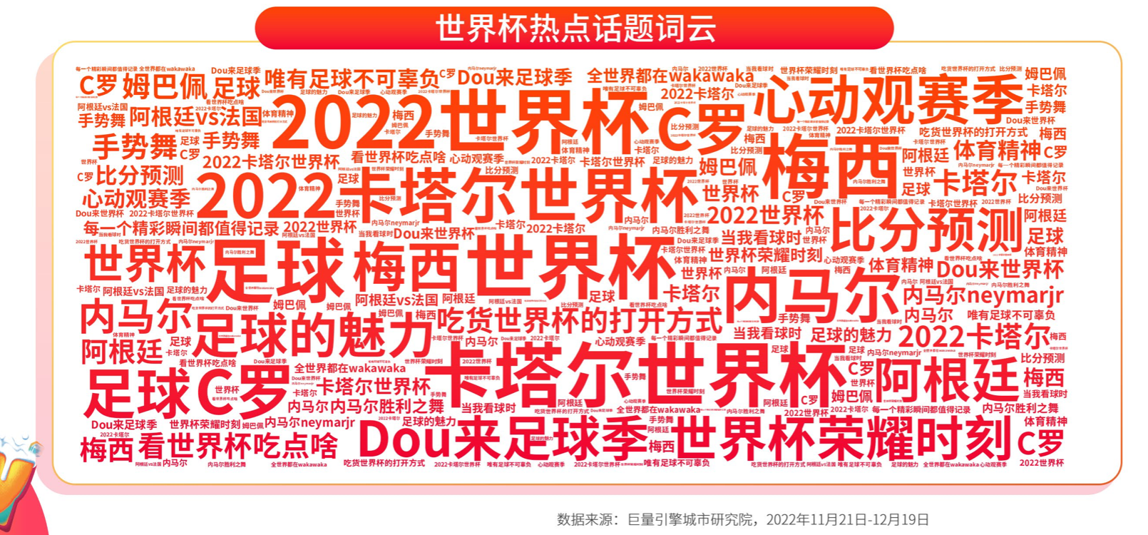 2022年卡塔尔世界杯圆满落幕,阿根廷在决赛中战胜上届冠军法国队,第三次捧起大力神杯,这场一个多月的足球盛会也在抖音上广为传播,获得大量用户关注。此次世界杯期间,抖音作为2022年卡塔尔世界杯持权转播商和中央广播电视总台直播战略合作伙伴,全程直播了世界杯的各轮赛事,为用户提供了一个沉浸式体验世界杯的平台。