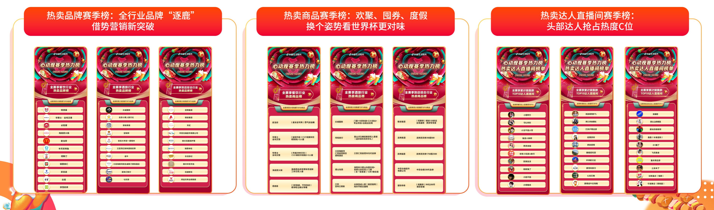 伴随卡塔尔世界杯落幕,抖音生活服务「心动观赛季」活动也迎来完美收官,「心动观赛季热力榜」全赛季榜单正式发布,榜单涵盖餐饮、酒旅、到店综合三大行业,开设热卖商品赛季榜、热卖品牌赛季榜、热卖达人直播间赛季榜,针对整体活动期间GMV表现突出的品牌、商品、达人等进行排名,助力更多品牌商家洞察「心动观赛季」营销趋势与消费者偏好。