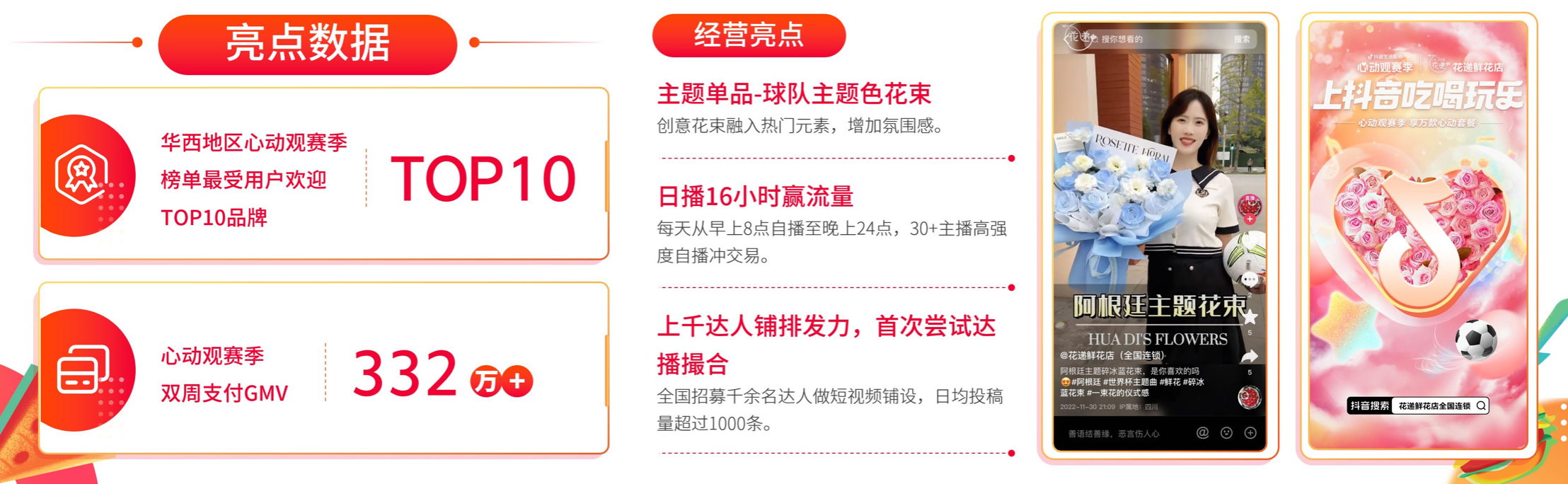 在世界杯期间,花递鲜花巧妙抓住抖音生活服务「心动观赛季」热点打造热门产品,30多名主播保障每日16小时自播,更铺设上千达人,有效拓展经营手段,并以此为契机推动首次达播尝试,借势节点营销寻求更多经营突破。