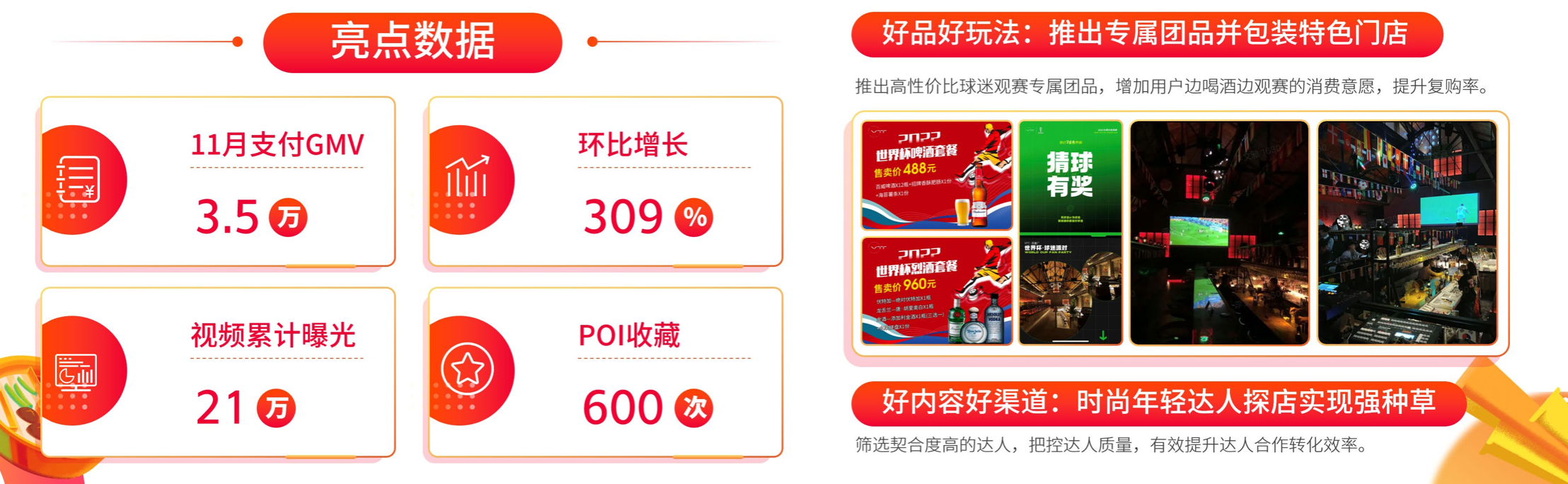 作为后奥运时代最具影响力的世界级赛事,世界杯点燃全球数十亿球迷关注,抖音生活服务携手商家共创节点营销新玩法,通过平台优质资源助力品牌经营,聚势打造世界杯专属的营销狂欢盛宴。