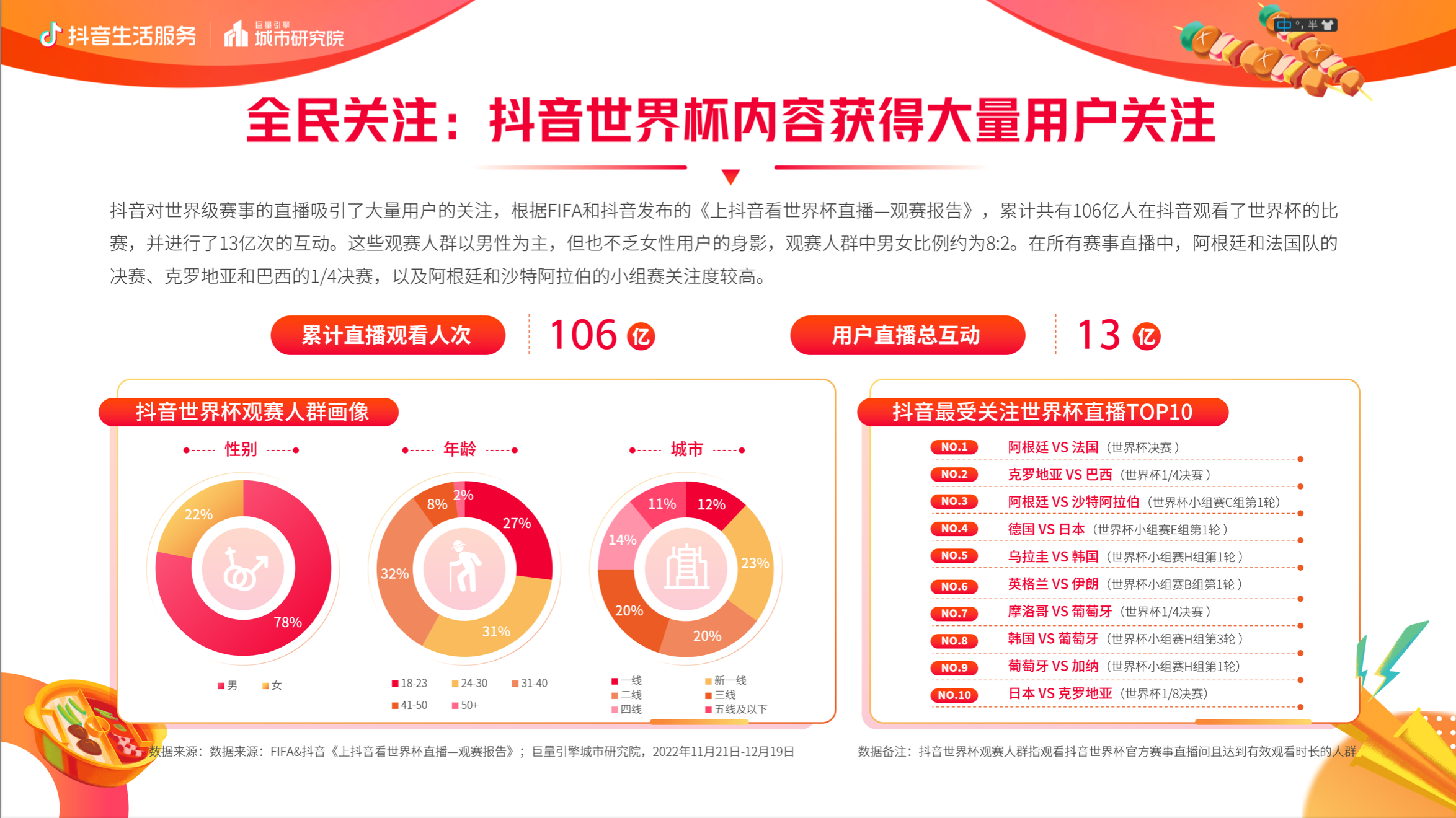 这场世界级赛事在抖音上的直播,吸引了全民级别的用户关注。据FIFA和抖音发布的《上抖音看世界杯直播——观赛报告》,累计共有106亿人在抖音观看了世界杯的比赛,并进行了13亿次的互动。