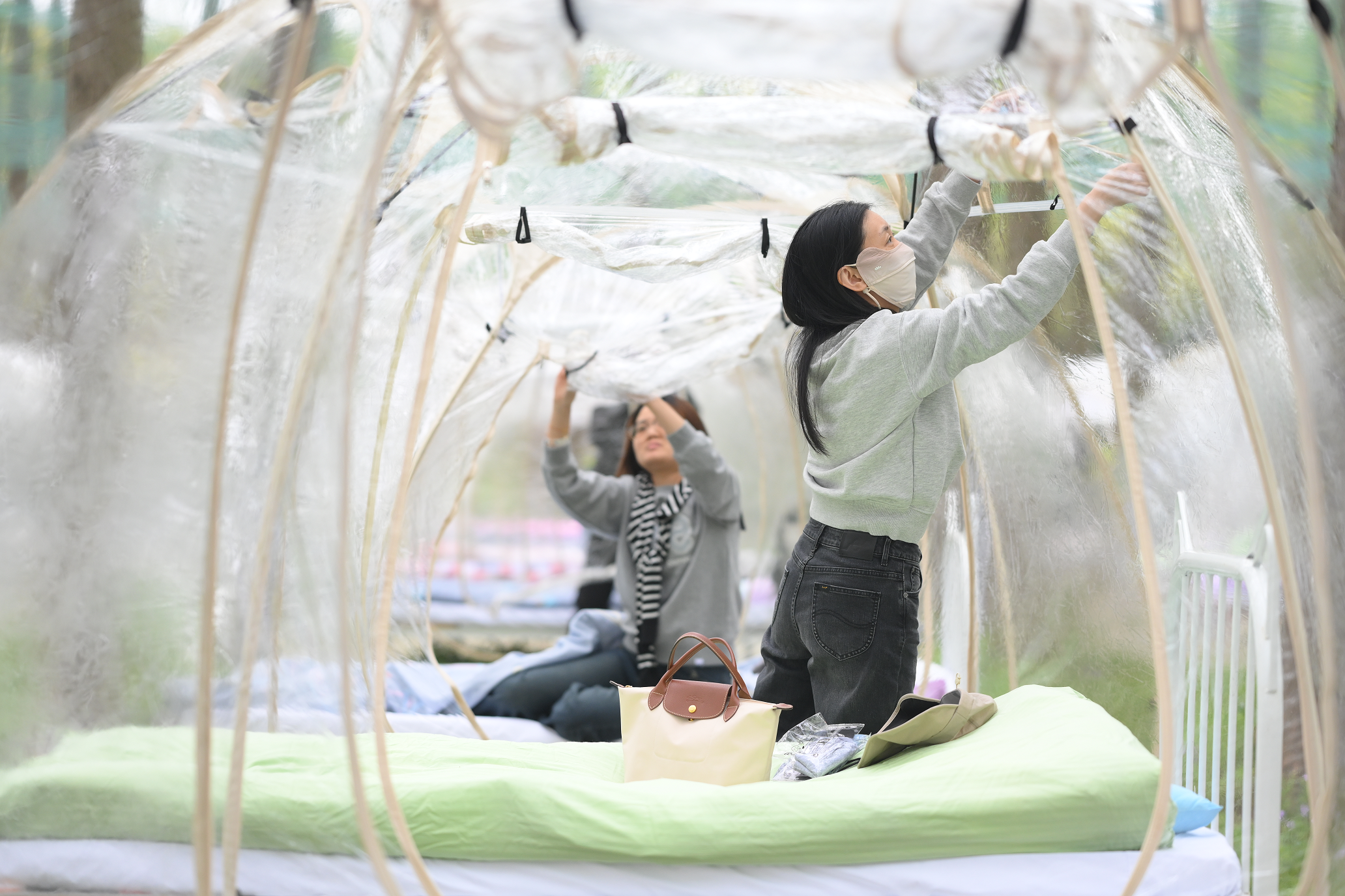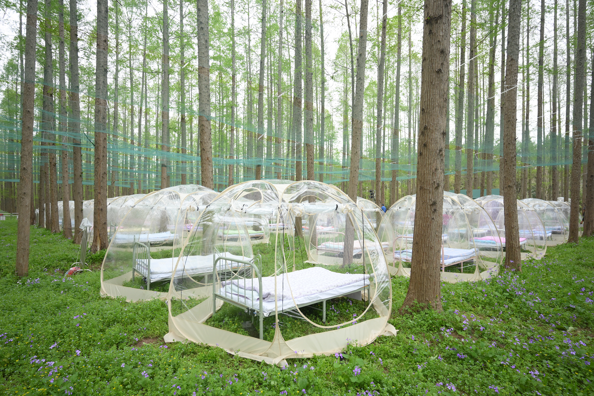 新的睡眠区里,一张张床位被透明穹顶帐篷轻轻罩起,既保留了林间的天光和树影,也为参与者提供了相对独立的休息边界。帐篷并没有把人和自然隔开,躺下后依然能看见四周草木与林间层次。这样一种“被包裹着亲近自然”的状态,也让“在森林里睡一觉”这件事有了更完整的沉浸感。