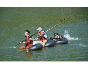 1-2-1,加油!三名衣着统一的运动员在鹤山宅梧镇佛坳水库划着橡皮筏奋力冲刺。12月10日,来自全国各地近百名户外运动教练员云集宅梧,开展教学技能竞赛。宅梧镇健......