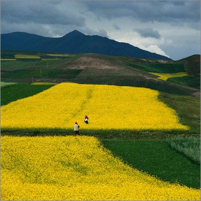 到了7月前后,南方的油菜早已扬花结籽收获入仓,甚至变成清亮的油液。而海拔3200多米的青海湖一带,此时的油菜花却正开得喧嚣。浓艳的黄花,紧围着青海湖大半圈湖岸,足有百万亩,在高原深蓝的天空下,繁花金黄一片,嵌镶在湛蓝的青海湖岸上,无际无边。