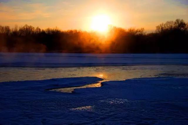 河面上冒着腾腾热气、烟雾缭绕,两边的树枝都挂着冰晶,透着夕阳的余辉,流光异彩,极为壮观!